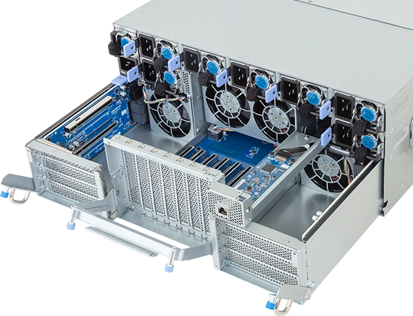 PCIe cage design and front-access motherboard/GPU trays for streamlined maintenance.