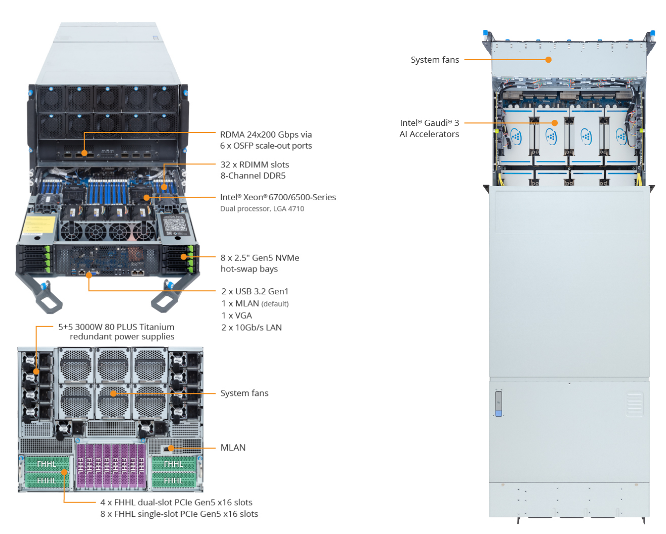 Building on extensive experience in accelerator design and deep expertise in microarchitecture and software, Intel has developed the third generation of Gaudi AI accelerators, Intel® Gaudi® 3, delivering breakthrough performance and efficiency. These accelerators achieve competitive results that rival leading solutions while maintaining a scalable platform. With a strong emphasis on Ethernet adoption and an open system architecture, Intel Gaudi 3 AI accelerators set a new standard for AI infrastructure, enabling businesses to scale efficiently and meet the evolving demands of tomorrow's AI challenges.