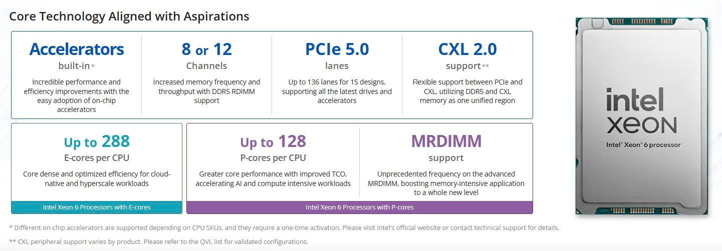 Intel® Xeon® 6 is a new generation of processors that has tailored its CPU lineup to target all uses cases such as Cloud Computing, AI, Analytics, and Edge & IOT. Whether it's high compute density that is dependent on core count and power efficiency or AI/HPC applications that heavily rely on strong single-core performance, this new platform covers them all with its Performance cores (P-cores) and Efficient-cores (E-cores). Along with flexible I/O options, integrated accelerators, and support for CXL 2.0 devices, Intel Xeon 6 fulfills customer needs across the broadest range of data center workloads, segments, and deployment models.