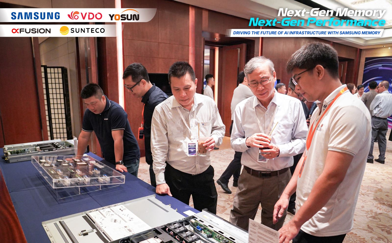 Khu vực đón tiếp được bố trí với các gian trưng bày sản phẩm Samsung Memory và khu demo máy chủ của xFusion, giúp khách tham dự tiếp cận thông tin và sản phẩm ngay từ đầu chương trình. Bên cạnh đó, khách mời có thể trao đổi trực tiếp với chuyên gia quốc tế của Samsung cùng đội ngũ kỹ thuật từ Yosun, xFusion và Sunteco để thảo luận về nhu cầu triển khai hạ tầng trong thực tế. Các hoạt động trao đổi và kết nối diễn ra xuyên suốt, tạo điều kiện để các đơn vị trong ngành chia sẻ kinh nghiệm và tìm kiếm giải pháp vận hành trung tâm dữ liệu hiệu quả.